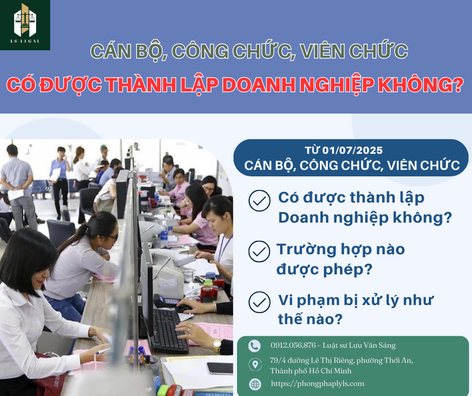 Theo Điều 17 Luật Doanh nghiệp 2020, một trong những đối tượng không được quyền thành lập và quản lý doanh nghiệp là cán bộ, công chức, viên chức. Quy định này tiếp tục được siết chặt hơn tại Luật số 76/2025/QH15 – Luật sửa đổi, bổ sung một số điều của Luật Doanh nghiệp 2020 (thông qua ngày 17/6/2025, có hiệu lực từ 01/07/2025).
