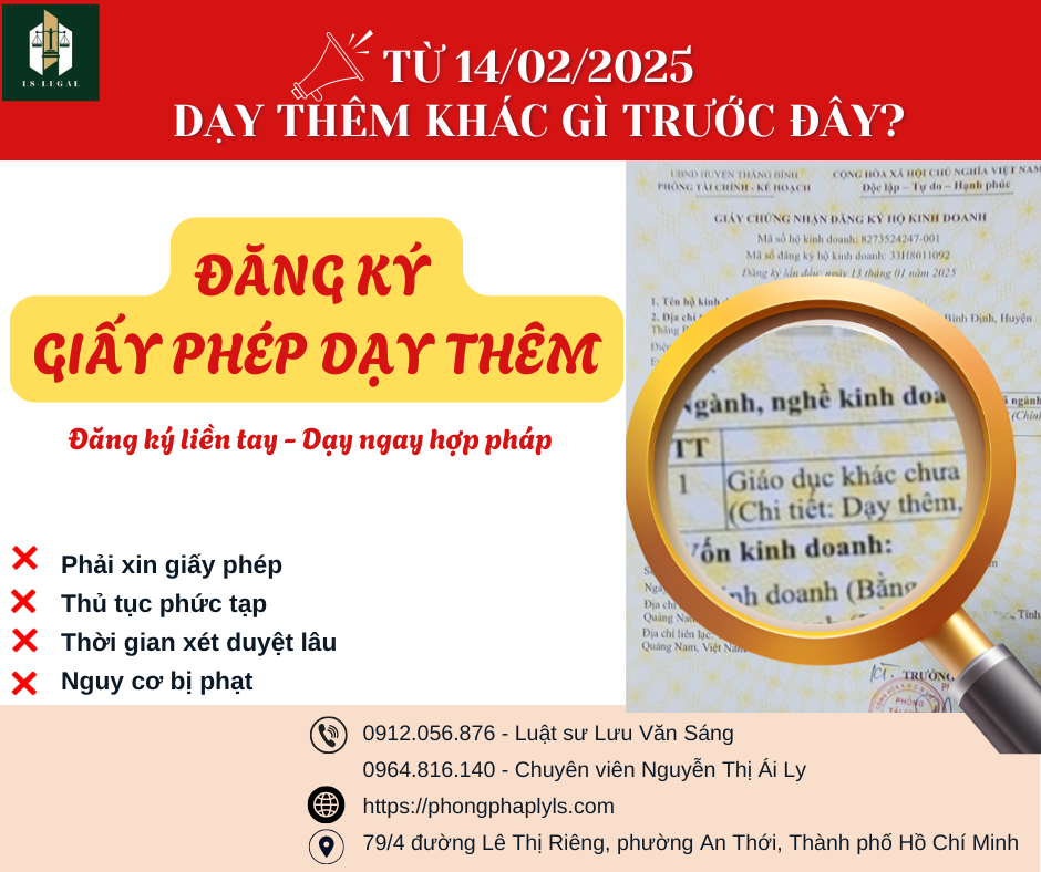 Từ ngày 14/02/2025, theo Thông tư 29/2024/TT-BGDĐT, mọi tổ chức hoặc cá nhân dạy thêm ngoài nhà trường có thu học phí bắt buộc phải đăng ký kinh doanh, nếu không sẽ bị xử lý vi phạm hành chính. Việc đăng ký kinh doanh cho cơ sở dạy thêm không chỉ là thủ tục, mà còn bảo vệ quyền lợi pháp lý, uy tín và an tâm lâu dài.
