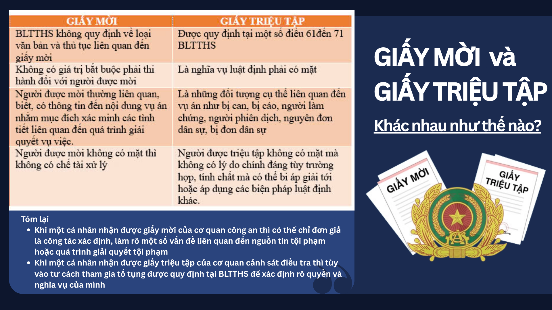 Trong thực tiễn, nhiều người dân khi nhận được “Giấy mời” hoặc “Giấy triệu tập” từ cơ quan công an thường không phân biệt được ý nghĩa pháp lý của hai loại giấy này, dẫn đến tâm lý hoang mang hoặc ứng xử chưa phù hợp.